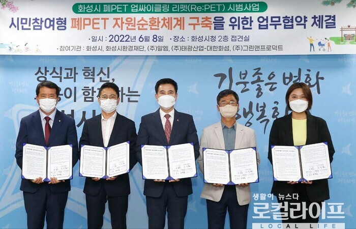 [화성=로컬라이프] 송준형 기자 = 화성시가 (재)화성시환경재단, ㈜알엠, 태광산업(주), 대한화섬(주), ㈜그린앤프로덕트 등과 지난 8일, ‘폐PET 자원순환체계 구축 업무협약’을 체결했다.