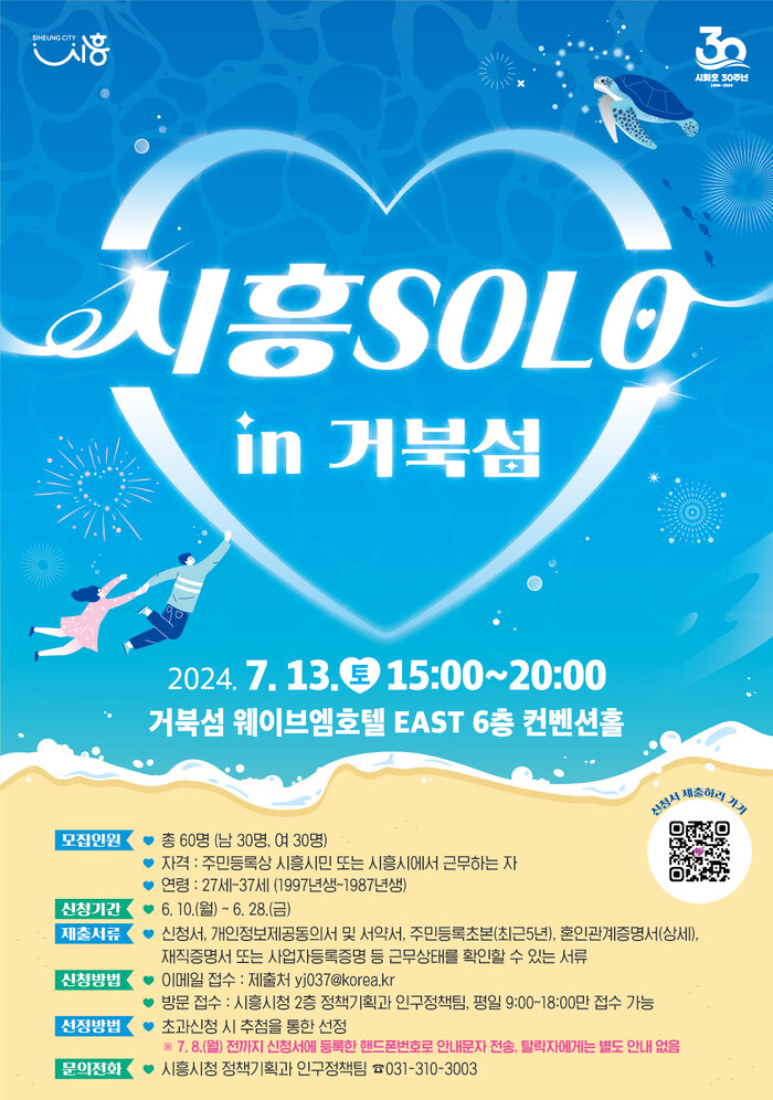 시흥시(시장 임병택)는 시화호 30주년을 기념해 아름다운 거북섬에서 결혼 적령기 미혼 남녀에게 소중한 인연을 만날 기회를 제공하고 결혼 친화 분위기를 조성하는 행사인 ‘시흥 솔로(SOLO) 인(in) 거북섬’에 참여할 미혼남녀 시흥시민을 모집한다.
