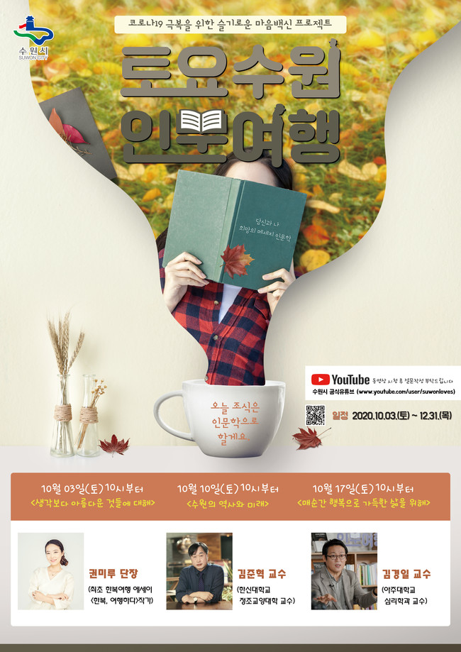 3일 권미루 작가의 ‘생각보다 아름다운 것들에 대해’를 주제로 한 강의를 업로드 했고, 김준혁 한신대학교 정조교양대학 교수의 강연 ‘수원의 역사와 미래’(10월 10일), 김경일 아주대학교 심리학과 교수의 강연 ‘매 순간 행복으로 가득한 삶을 위해’(10월 17일)가 이어진다.