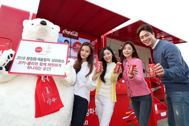 또한, 코카-콜라는 평창동계올림픽 성화봉송 현장에서도 코카-콜라 만의 짜릿한 경험을 제공한다. 1992년 바르셀로나 올림픽부터 올림픽 성화봉송에 참여해오고 있는 만큼, 오랜기간 올림픽 마케팅 노하우를 바탕으로 코카-콜라 콘보이 차량을 통해 올림픽 성화봉송의 축제분위기를 만들며 코카-콜라 제품 샘플링은 물론, 응원용 코카-콜라 폴라베어 글로브, 글로우 보틀 등 다양한 경품을 제공한다.