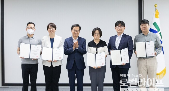 | ▲ 김동연 경기도지사(왼쪽에서 세 번째)가 ‘경기도 2050 탄소중립·녹색성장위원회’ 위원들에게 위촉장을 수여했다. (사진출처=김동연 페이스북) |