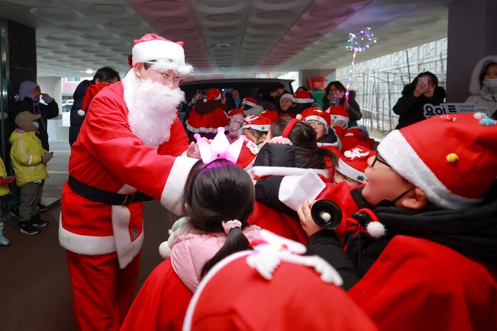 아이들의 간절한 부름에 붉은 옷의 흰 수염을 한 산타 할아버지가 용인특례시 캐릭터 ‘조아용’의 손을 잡고 등장하자 아이들은 환호성으로 환영했다. 산타 할아버지 복장의 주인공은 이상일 용인특례시장이었다.