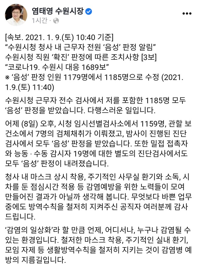염태영 시장은 “근무 중 마스크 착용, 주기적인 사무실 환기와 소독, 시차를 둔 점심시간 적용 등 감염 예방을 위한 노력들이 모여 ‘전원 음성’이라는 결과가 만들어진 게 아닐까 생각해 본다”며 “방역 수칙을 철저하게 지켜준 공직자 여러분께 감사드린다”고 말했다.