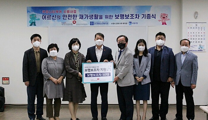서명철 국민건강보험공단 인천경기지역본부장을 비롯한 관계자들은 14일 장안구 SK청솔노인복지관을 방문해 보행보조차(실버카)를 전달했다.