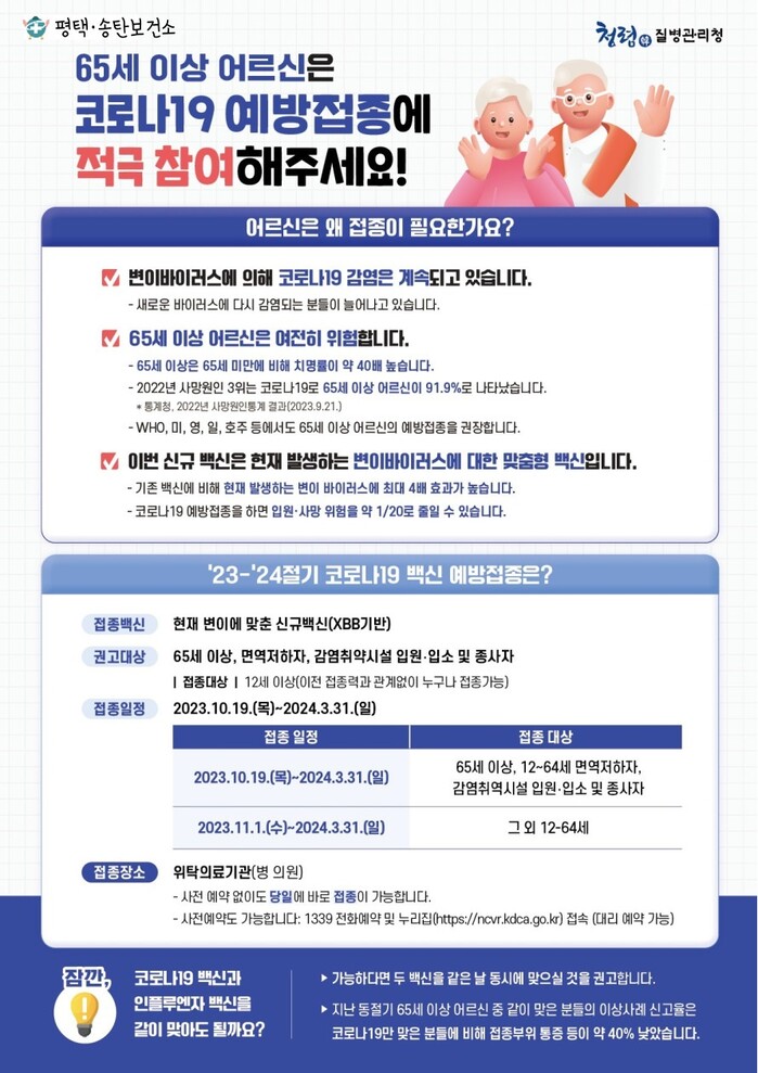 평택시(시장 정장선)는 지난 19일부터 65세 이상 어르신, 12~64세 면역저하자, 감염 취약 시설 입원·입소·종사자 등 고위험군 접종이 시작됐다고 밝혔다.