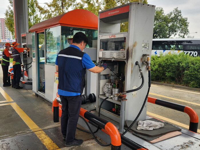 사진/한국가스안전공사 관계자가 LPG충전소에서 가스 누출을 점검하고 있다.(사진제공=수원시)