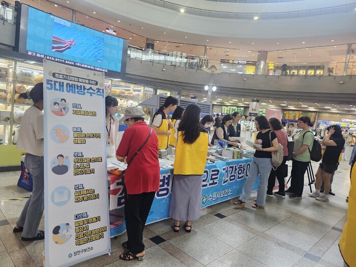 수원시보건소가 27일 수원역 대합실에서 ‘건강한 여름나기를 위한 감염병 예방 캠페인’을 펼쳤다.