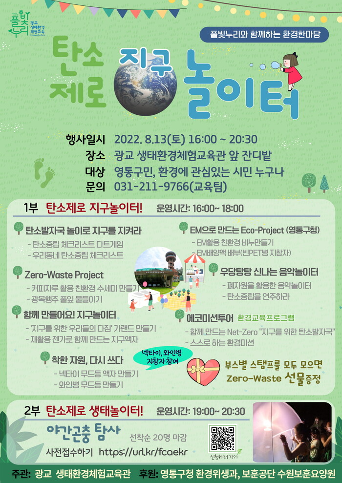 수원시 광교생태환경체험교육관 관계자는 “코로나19와 더위로 지친 시민들이 ‘탄소제로! 지구놀이터’에 참여해 즐거운 추억도 만들고, 탄소중립을 위한 실천 방법도 함께 생각해보는 시간이 될 것”이라고 말했다.