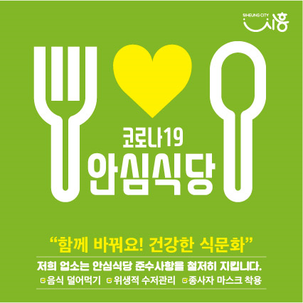 시흥시(시장 임병택)는 사회적 거리두기에 따라 음식점 내 생활방역 수칙을 준수 문화 확산을 위해 ‘코로나 19 안심식당’ 지정을 추진한다.