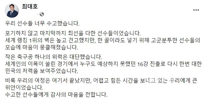 아울러 “비록 우리의 여정은 여기서 끝났지만, 어렵고 힘든 시간을 보내고 있는 우리에게 큰 위안이었다”며 “수고한 선수들에게 감사의 마음을 전한다”고 격려했다.