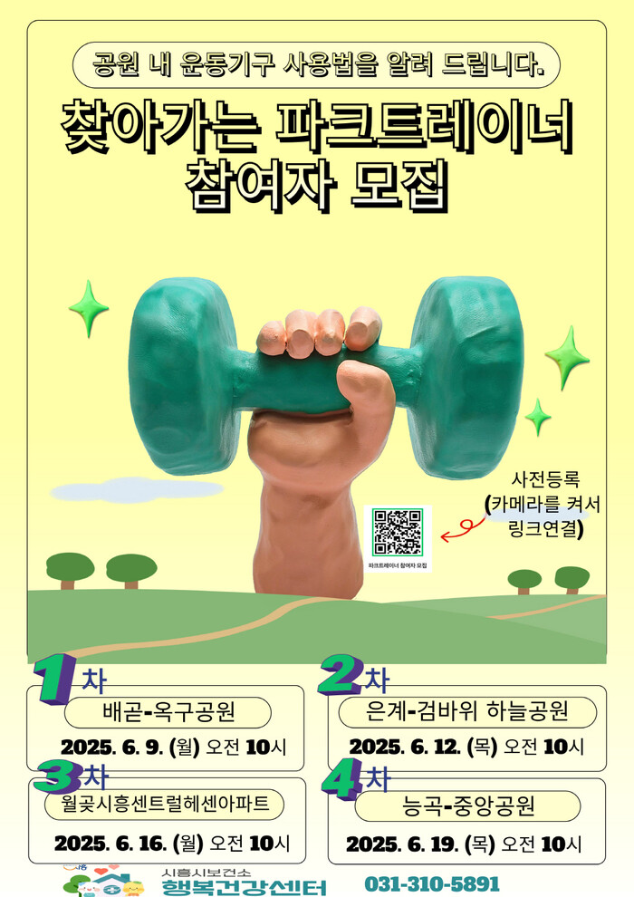 시흥시행복건강센터는 오는 6월 9일부터 19일까지 4차례에 걸쳐 공원 내 운동기구의 올바른 사용법을 전문 강사가 직접 찾아가서 알려주는 ‘파크 트레이너’ 교육을 운영하고 참여자를 모집한다.