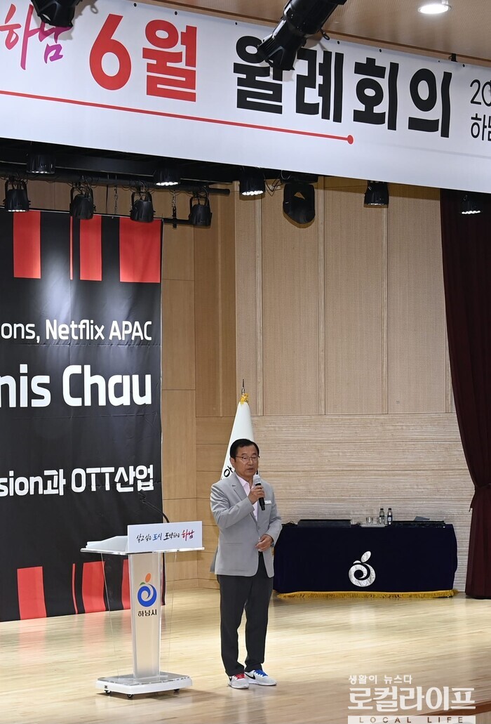 이와 관련해 이현재 하남시장은 자신의 페이스북을 통해 “오늘(14일) 월례회의에서는 데니스 차우(Dennis Chau) 넷플릭스 아시아 더빙책임자께서 한류(K-Culture)의 미래 비전과 OTT산업에 대해 강의해 주셨다”며 “강의가 K스타월드 사업추진의 방향성 설정에 많은 도움이 될 것으로 기대된다”고 전했다.