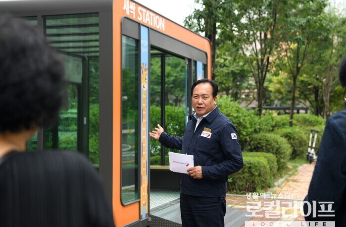 | ▲ 이권재 오산시장이 세교센트럴파크아파트에 설치된 영유아 등·하원 쉘터 ‘새싹스테이션 1호’를 찾아 개소를 축하하며 점검하고 있다. (사진출처=이권재 페이스북) |