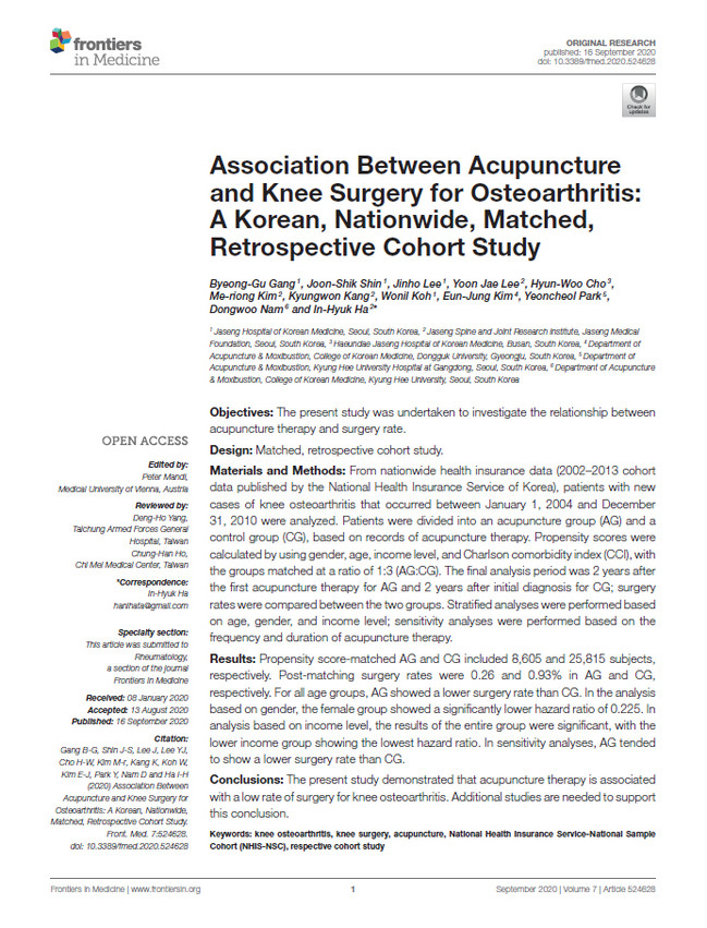 자생한방병원 척추관절연구소(소장 하인혁)는 무릎관절염 환자가 침치료를 받을 경우 수술률이 줄어들고, 특히 노인이나 여성의 경우 수술률이 약 80% 감소한 것으로 나타났다고 5일 밝혔다. 해당 연구논문은 SCI(E)급 국제학술지 ‘Frontiers in Medicine (IF=3.9)’ 최신호(9월호)에 게재됐다.