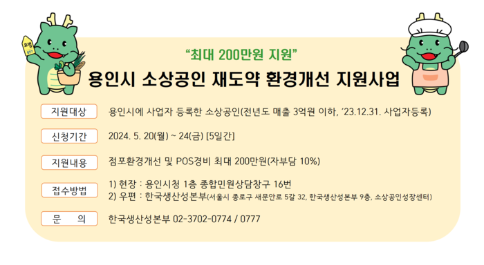 시 관계자는 “소비심리 위축으로 경영에 어려움을 겪는 소상공인을 돕기 위해 마련된 지원사업에 많은 참여를 바란다”며 “이 사업이 소상공인 점포 환경을 개선하고 용인의 골목상권과 민생경제 활성화 계기가 될 것으로 기대한다”고 말했다.