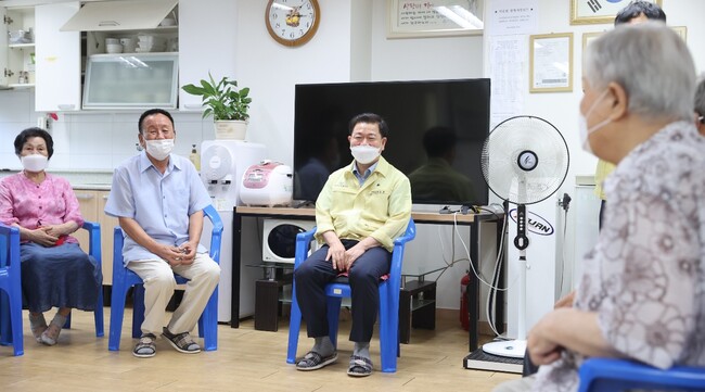 사진/박승원 광명시장은 연일 폭염이 기승을 부리는 가운데 7월 21일 충현역사공원 임시선별진료소, 실내·외 무더위쉼터를 방문해 운영상황을 점검했다. (실내 무더위심터 경로당 방문)(사진제공=광명시)