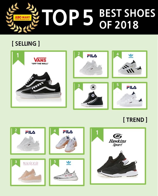 ABC마트가 선정한 2018년 신발 트렌드를 이끈 제품으로는 ‘호킨스 웜앤라이트’, ‘휠라 디스럽터2’, ‘누오보 레테라’, ‘휠라X우왁굳’, ‘아디다스 이지부스트 350V’가 뽑혔다.