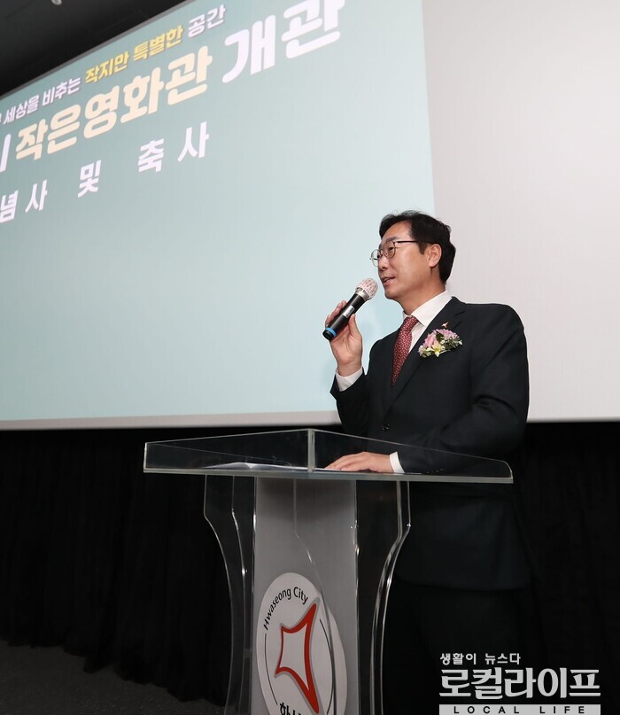 | ▲ 정명근 화성시장이 마도면 ‘화성시 작은영화관’ 개관식에서 축사를 하고 있다. (사진출처=정명근 페이스북) |