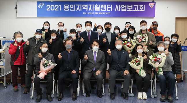 백군기 용인시장이 16일 용인시사회적경제지원센터에서 열린 ‘2021 용인지역자활센터 사업보고회’에 참석해 올 한해 고생한 관계자들을 격려했다.