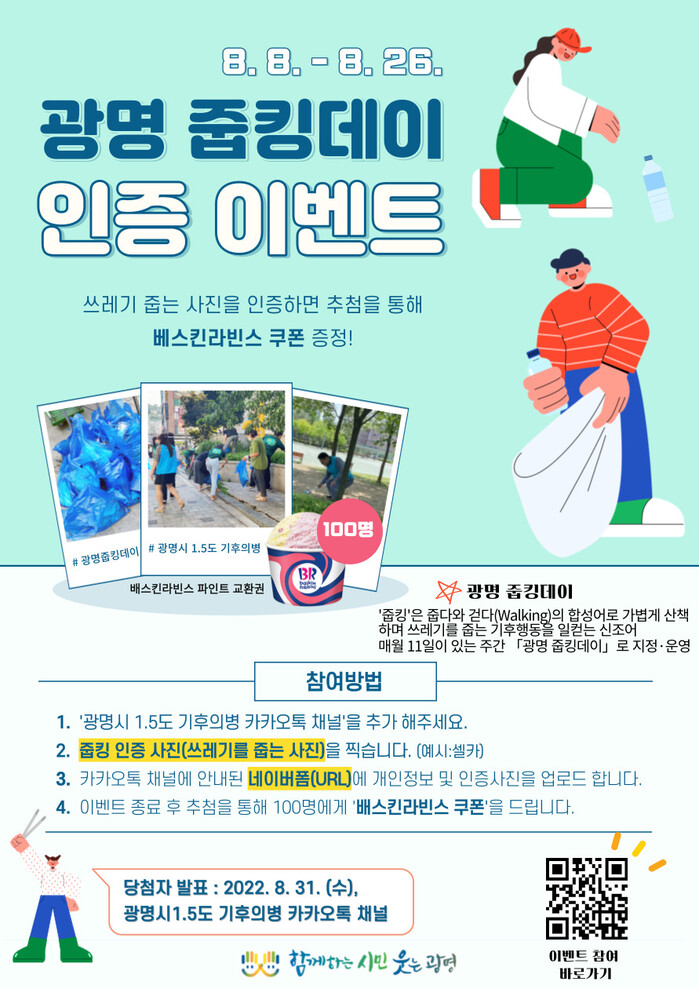 이벤트 참여는 쓰레기를 담을 봉투와 장갑을 챙겨 산책이나 조깅을 하면서 쓰레기를 줍는 사진을 촬영해 네이버폼에 등록하면 된다. 당첨자는 31일 광명시 1.5도 기후의병 카카오 채널에서 확인할 수 있다.