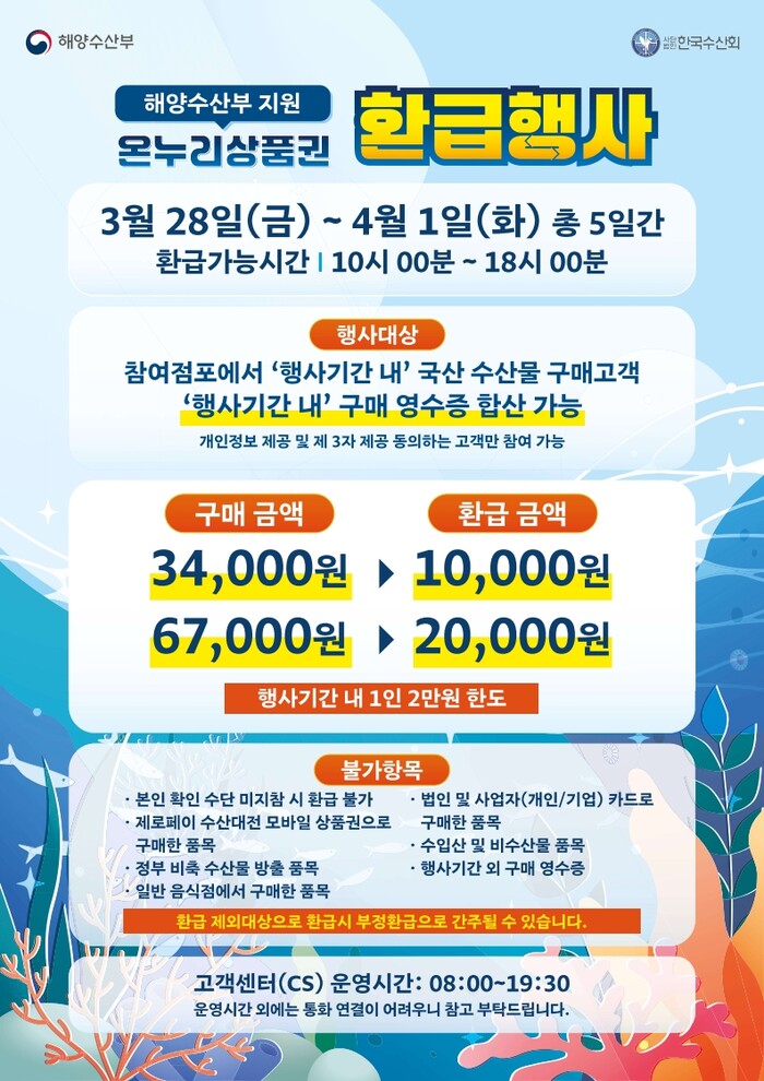 환급 기준은 ▲3만 4천 원 이상~6만 7천 원 미만이면 1만 원 ▲6만 7천 원 이상 구매 시 2만 원이다.