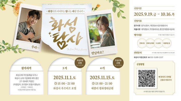 참가 신청은 홍보 포스터의 큐알(QR)코드 또는 화성시통합예약시스템에서 주민등록초본, 재직증명서, 혼인관계증명서(상세) 등 관련 서류를 첨부해 신청하면 된다. 자세한 사항은 화성시 콜센터(☎1577-4200)로 문의하면 된다.