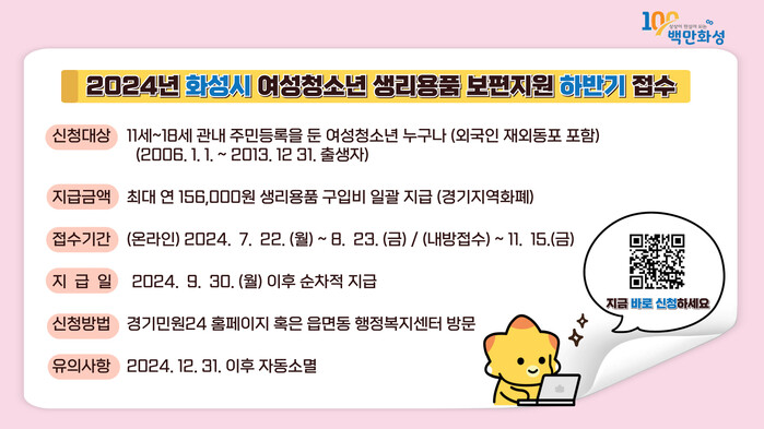 화성시(시장 정명근)가 오는 22일부터 다음달 23일까지 2024년 여성청소년 생리용품 보편지원 사업 하반기 신청접수를 받는다.