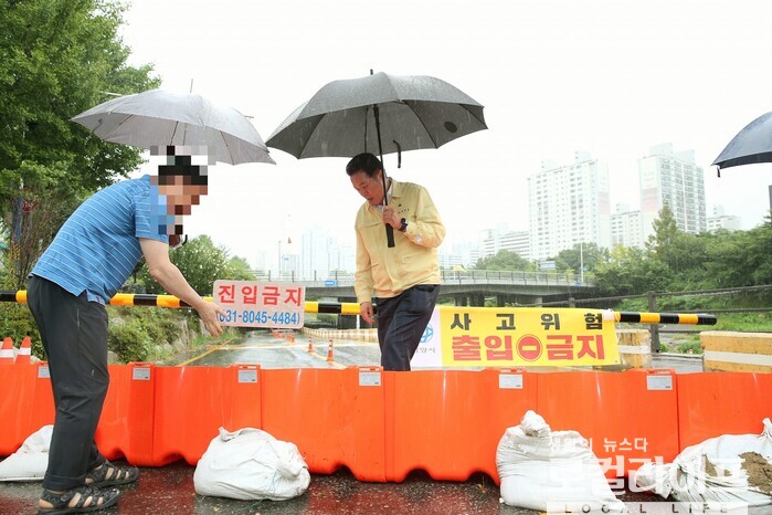 최대호 시장은 “공사장 가림막 등 낙하물 안전 조치, 토사 유출 방지 등 현장 관계자분들에게 다시 한번 당부 말씀을 드리고 왔다”며 “하천 내 둔치 주차장, 하상도로, 세월교 등 차량 이동조치 점검 및 진입 통제선이 잘 설치되었는지도 살폈다”고 밝혔다.
