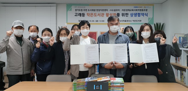 수원시지속가능도시재단 경기도청 주변 도시재생현장지원센터와 ㈜소셜코어, 라온경제교육사회적협동조합은 10월 30일 경기도청 주변 도시재생현장지원센터에서 ‘고래등 24시 마을 공유 소(작은도서관) 활성화를 위한 상생협약’을 체결했다.