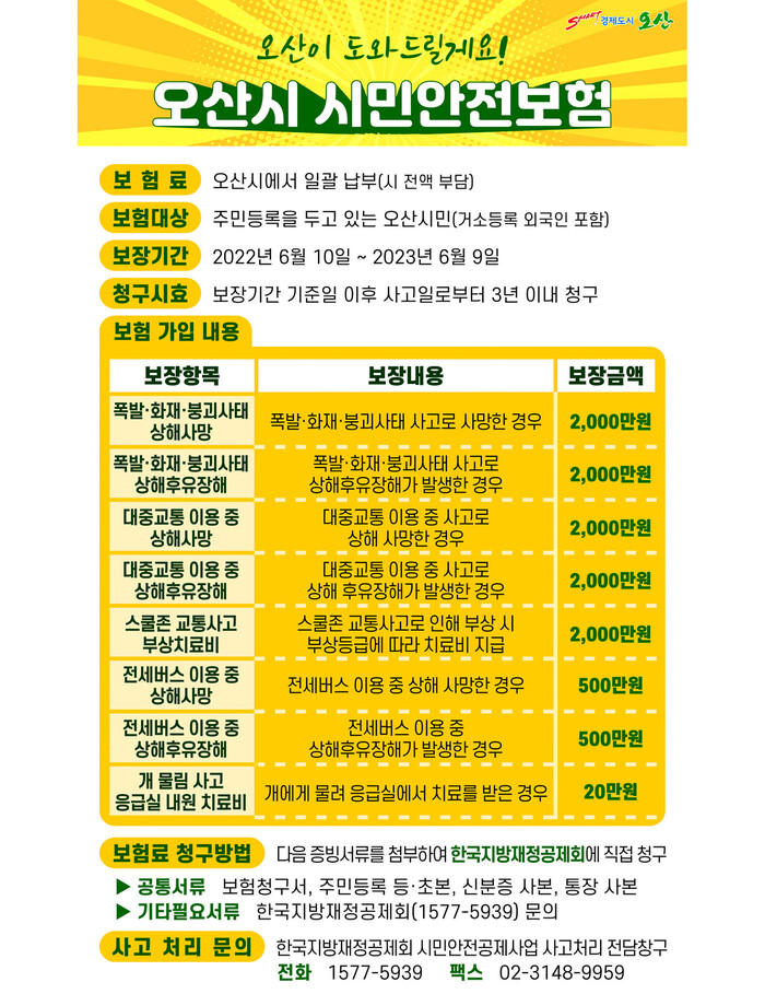 이어 “오산시민이라면 누구나 자동으로 가입되는 보험으로 현재 대중교통 이용 중 사고로 인한 장해·사망, 스쿨존 교통사고 부상치료비 등 8개 항목, 최대 2000만원까지 보장하고 있다”며 “시민들의 안전과 만약의 사고피해 회복은 그 무엇보다 중요한만큼 오산시가 함께 동행하겠다”고 밝혔다.