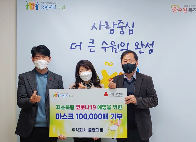 마스크 판매업체인 ㈜플랜제로도 이날 코로나19 확산 방지를 위한 이웃돕기 물품으로 마스크 10만 매를 기부했다.
