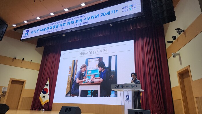 사진/최지은 작가가‘영화로 만나는 평등’ 행사에서 강연하고 있다.(사진제공=수원시)
