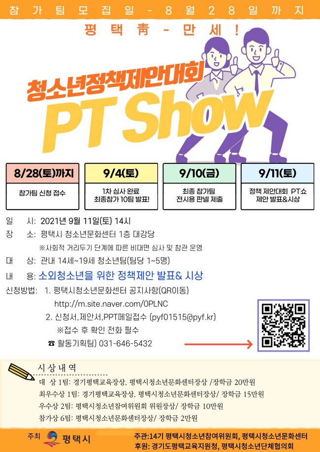 평택시(시장 정장선) 위탁기관인 (재)평택시청소년재단 평택시청소년문화센터(센터장 이종규)는 평택시 청소년참여위원회와 함께 청소년 정책제안대회 참가팀을 모집한다.