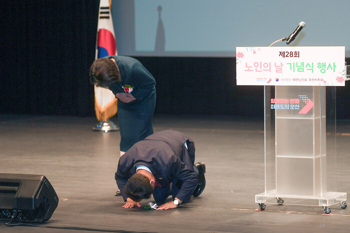 [오산=로컬라이프] 송준형 기자 = 이권재 오산시장은 제28회 노인의 날 행사에서 어르신들께 깊은 감사와 존경을 담아 큰절을 올렸다.
