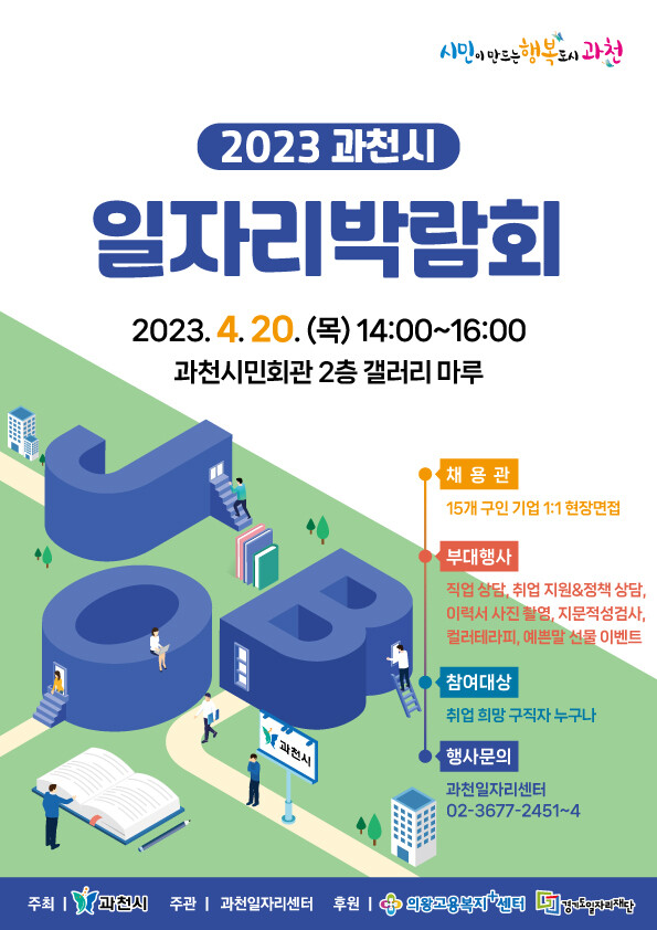 과천시는 경기침체에 따른 구인·구직난의 어려움을 해소하고, 취업시장에 활기를 불어넣기 위해 오는 20일 시민회관 2층 갤러리 마루·아라에서 오후 2시부터 ‘2023 과천시 일자리 박람회’를 개최한다고 13일 밝혔다.