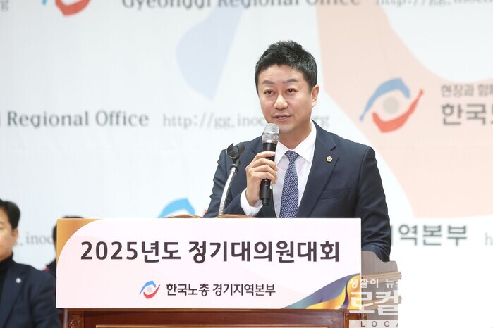 | ▲ 김진경 경기도의회 의장이 ‘한국노총 경기지역본부 2025년도 정기대의원대회’에 참석해 축사를 하고 있다. (사진출처=김진경 페이스북) |