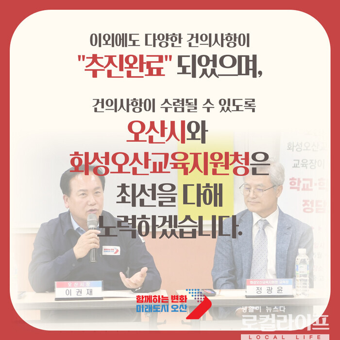 [오산=로컬라이프] 송준형 기자 = 이권재 오산시장이 ‘학교·학부모 정담회’를 통해 접수된 건의사항들에 대한 추진 의사를 밝혔다.