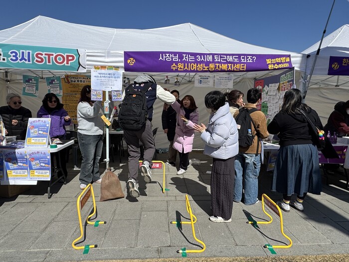 수원시 여성노동자복지센터는 7일 광화문 서십자각에서 열린 ‘제41회 한국여성대회’ 현장에서 시민을 대상으로 ‘일·생활 균형 인식개선 캠페인’을 펼쳤다.