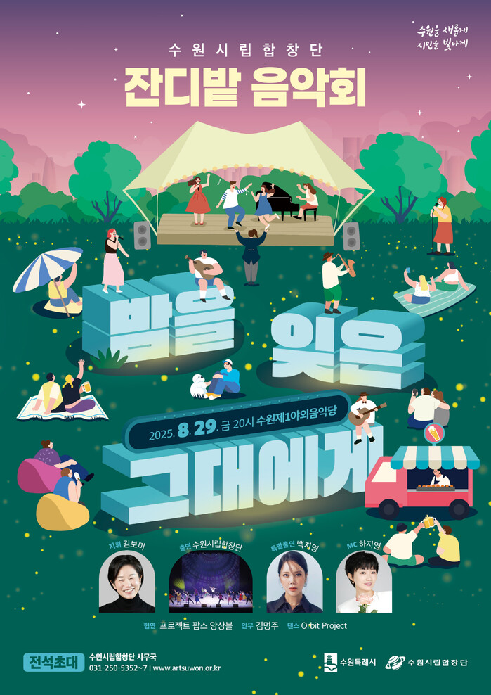수원시(시장 이재준)는 8월 29일 오후 8시 수원제1야외음악당(인계동)에서 ‘수원시립합창단 잔디밭 음악회-밤을 잊은 그대에게’를 연다.