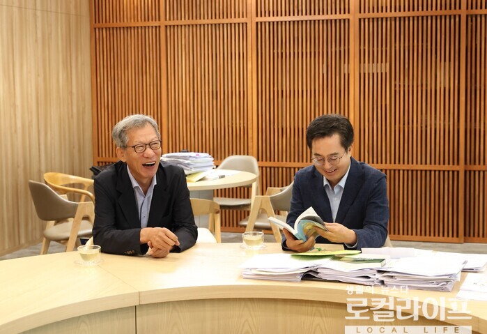 | ▲ 김동연 경기도지사(오른쪽)와 유홍준 전 문화재청장(왼쪽)이 환담을 나누고 있다. (사진출처=김동연 페이스북) |