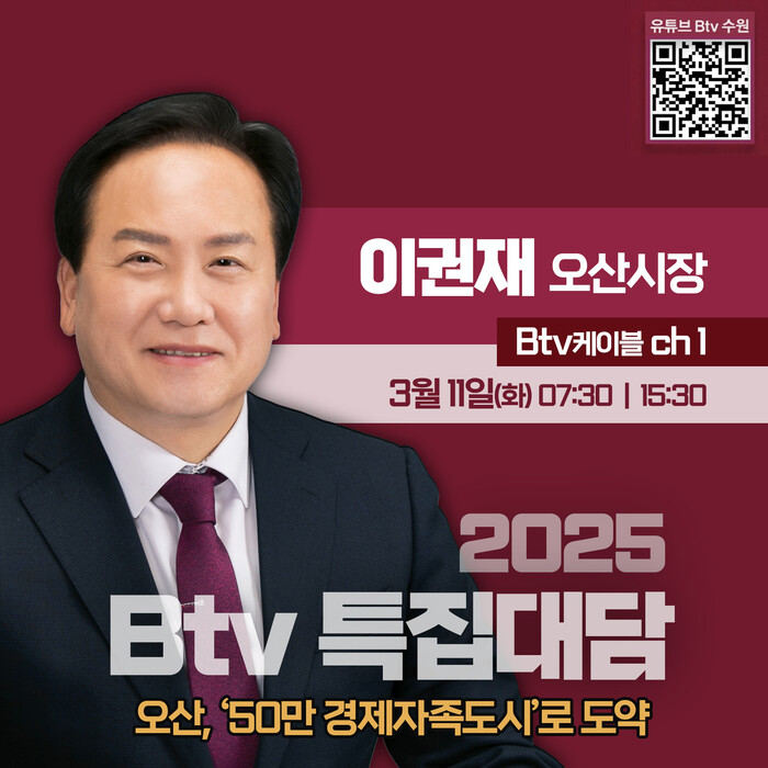 한편, 이권재 시장의 특집대담은 3월 11일 화요일 오전 7시 30분과 오후 3시 30분 두 차례, Btv 케이블 'ch1'과 유튜브 'Btv 수원'(https://youtu.be/FyetxcUiRh0?si=IrClYnkPtxfHSDOQ)에서 방송될 예정이다.