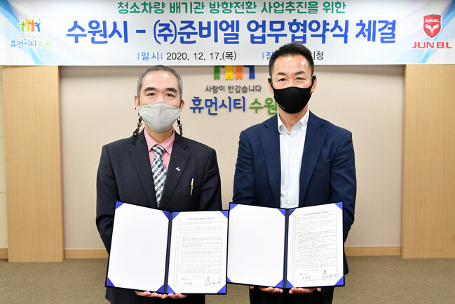 수원시와 ㈜준비엘은 17일 수원시청 귀빈실에서 ‘청소 차량 배기관 방향 전환 사업을 위한 업무협약’을 체결했다. 협약에 따라 ㈜준비엘은 배기관에 문제가 생기면 즉시 해결하고, 수원시는 사업 추진사항을 적극적으로 홍보하기로 했다.