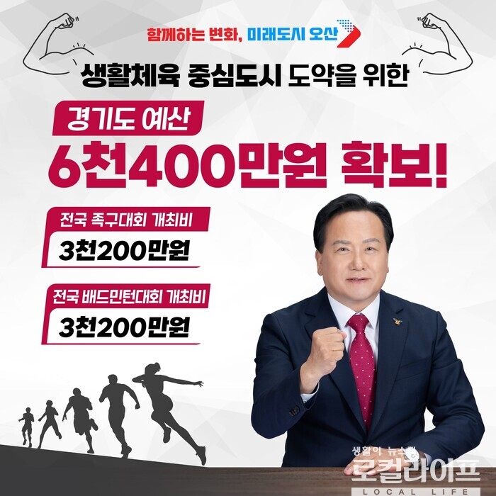 이와 관련해 이권재 오산시장은 8일, 자신의 페이스북에 <생활체육 중심도시 도약을 위한 예산확보 총력전>이라는 제목의 글을 올려 “오산시는 최근 경기도체육회 주관 제4차 체육진흥공모사업을 통해 전국 족구대회 개최 3200만원과 전국 배드민턴대회 개최 3200만원 등 사업비 총 6400만 원을 교부 받았다”고 밝혔다.