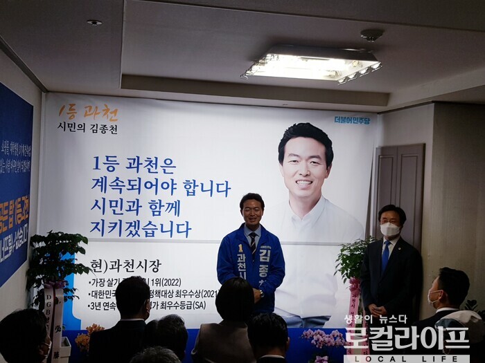 [과천=로컬라이프] 송준형 기자 = 더불어민주당 김종천 경기 과천시장 후보는 12일 오후 별양동 소재 렉스타운705호에서 선거사무소 개소식을 열고 6·1지방선거 재선 필승 의지를 다졌다.