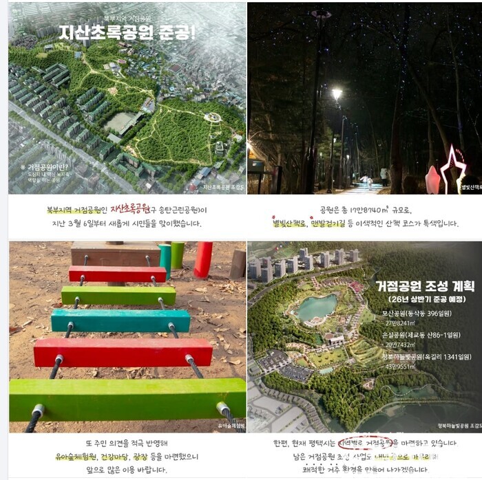 이어 “공원에는 별빛산책로, 맨발걷기길, 유아숲체험원, 건강마당, 광장 등 다양한 이색공간이 마련됐다”며 “모산, 은실, 청북하늘빛 등 ‘거점공원’ 조성도 내년까지 완료할 계획이다”라고 밝혔다.