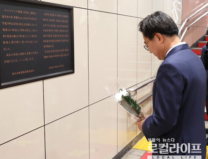 [경기=로컬라이프] 송준형 기자 = 투자 유치 등을 위해 해외 출장 중인 김동연 경기도지사가 마지막 일정으로 일본 신오쿠보역을 찾아 인명을 구하려다 숨진 한국인 의인 이수현 씨 추모비에 헌화했다.