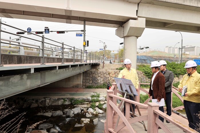 이상일 용인특례시장이 17일 처인구 역북동 387-3 첫다리교 현장을 찾아 안전 실태를 점검하고 시 전역을 대상으로 진행 중인 교량 점검에 최선을 다해줄 것을 관계 부서에 주문했다.