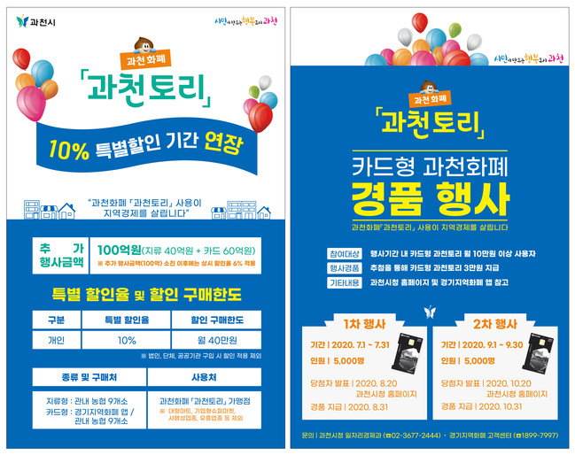 한편, 시는 과천화폐 이용 활성화와 지역 소비 촉진을 위해 7월과 9월에 카드형 과천토리를 각각 10만원 이상 사용한 사람을 대상으로, 총 1만 명을 추첨하여 경품으로 카드형 과천토리 3만원을 지급하는 경품 행사도 실시하고 있다.