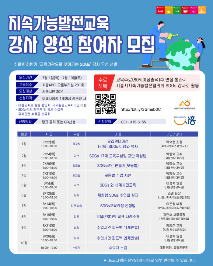 시흥시지속가능발전협의회(공동대표 임병택 시흥시장, 오인열 시흥시의회 의장, 김주석 대표회장)는 오는 7월 22일부터 8월 26일까지 진행되는 「지속가능발전교육 강사 양성과정」에 참여할 시민을 7월 19일까지 모집한다.