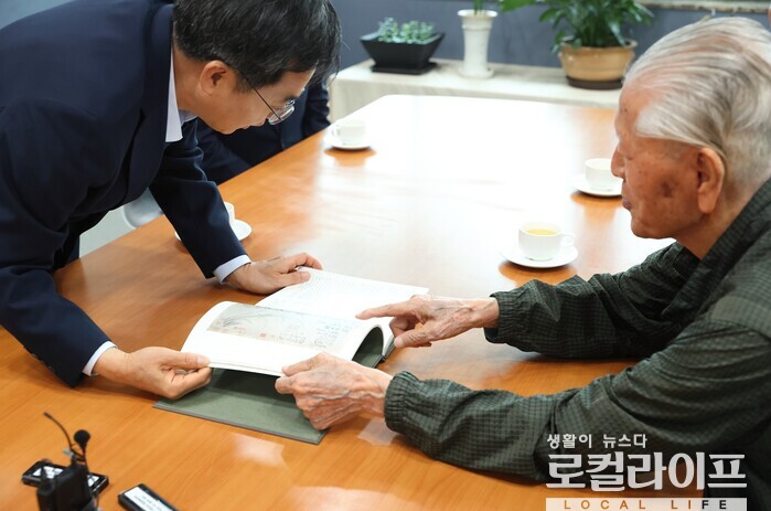 | ▲ 김동연 경기도지사(왼쪽)이 손창근 선생(오른쪽)과 환담을 나누고 있다. (사진출처=김동연 페이스북) |